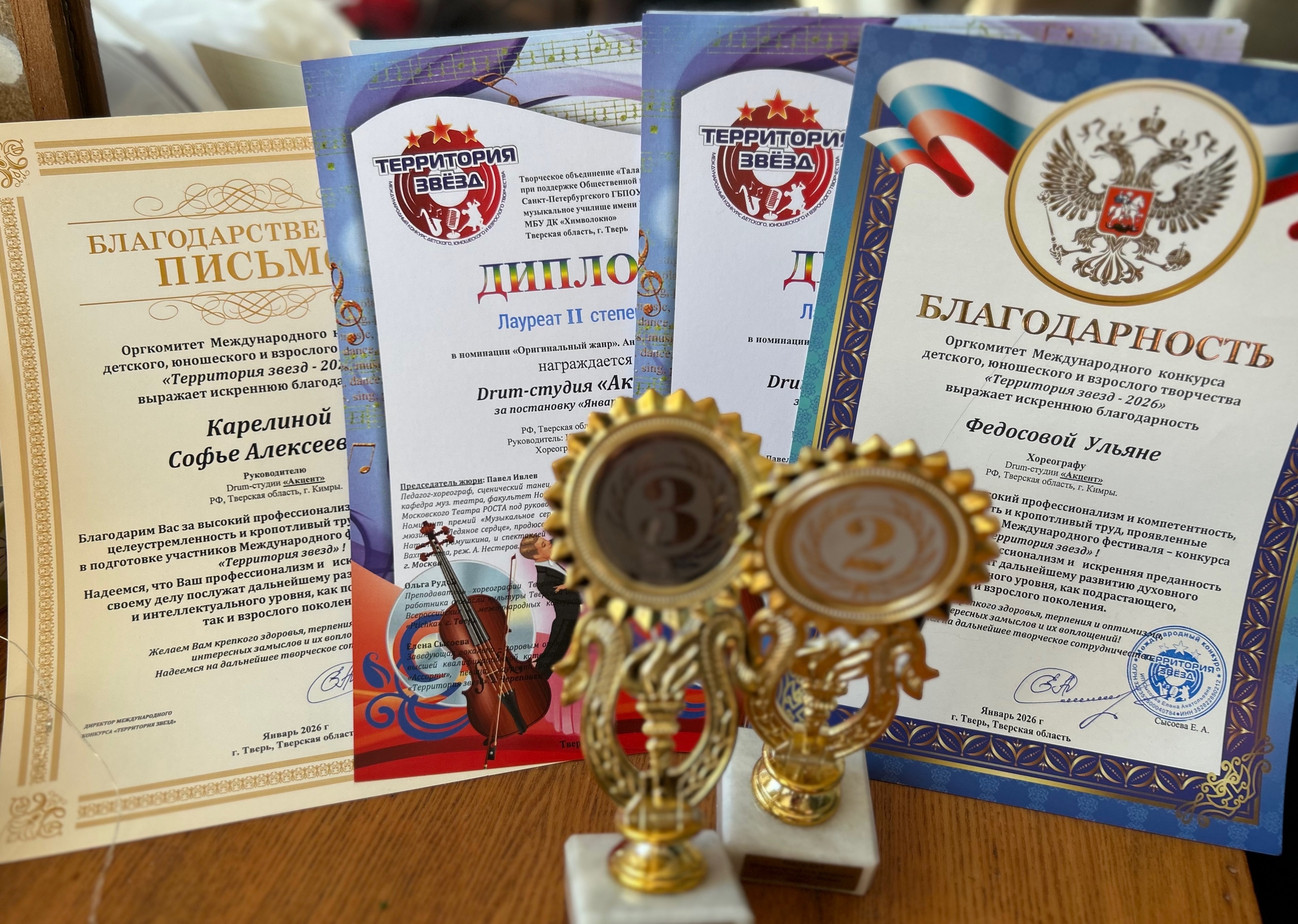 У нас прекрасная новость! 31 января в Твери состоялся международный конкурс «Территория звезд», где наш коллектив выступил триумфально!Ребята представили две новые композиции и завоевали два призовых места благодаря своему таланту и артистизму: